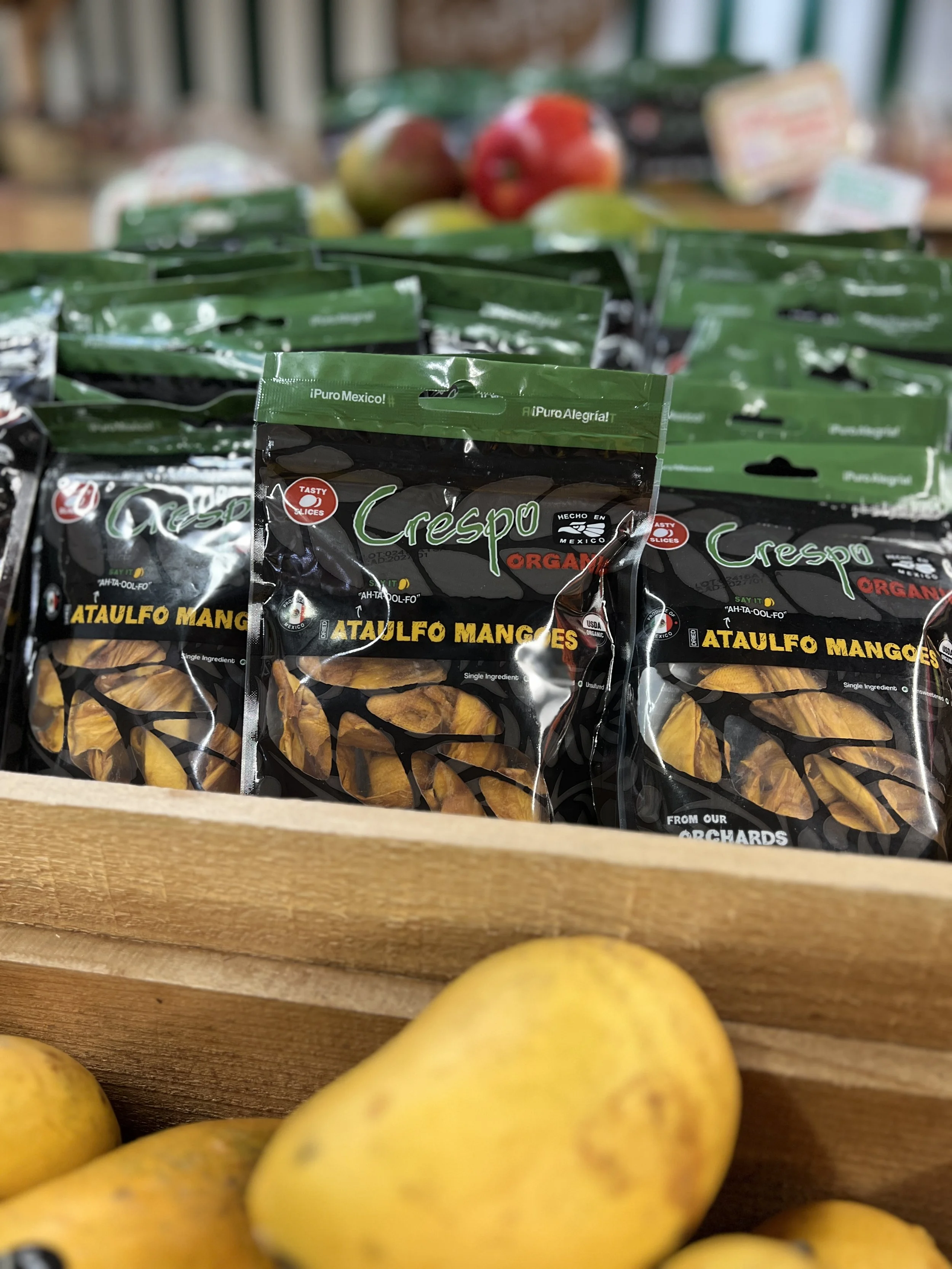 Are you too beat to mess with celeriac or peel potatoes? The Produce Porch has some quick grab-and-go options at the moment that provide wholesome snacks. They also make great pack-ables for the road and the trail. First we have the Braga Farms line of bagged nuts. Cashews, almonds, pistachios, and their Pacific Coast Blend, all of which are certified organic. Just look for the green bags! Another Cali jewel on the Produce Porch is the one pound box of Rancho Meladuco Medjool Dates. These dates were hailed by Bon Appetit as the “best on earth!” Last but not least we have just re-stocked on the Crespo-brand dried Ataulfo mango bags. Crespo is one of the few companies to pack dried Ataulfos because they are more labor-intensive, but the flavor is so worth it. We see why it is commonly known as the “honey mango”! Keep your eyes peeled for samples of this fine product out on the Porch.