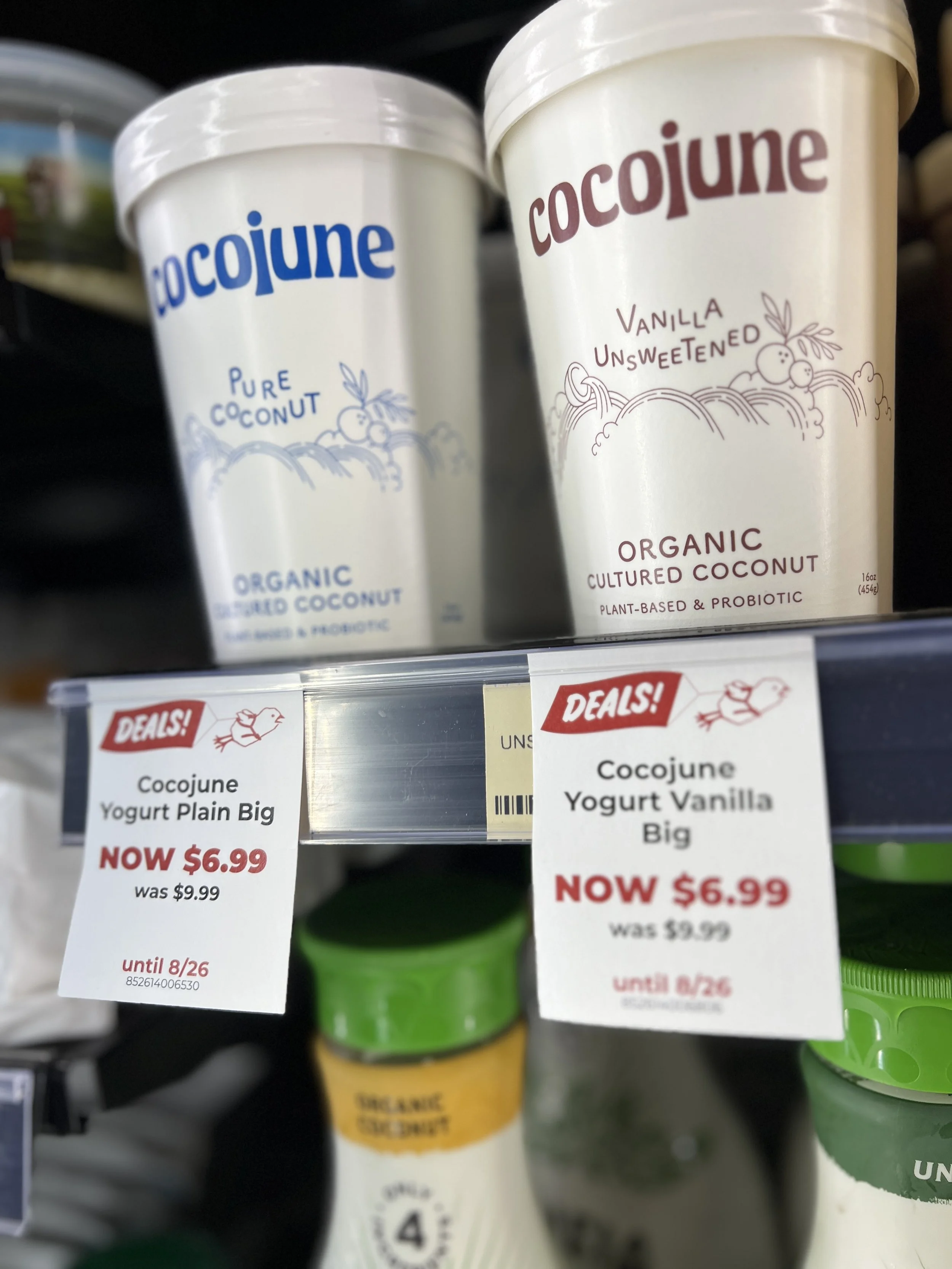 For full sun mornings when the heat cranks quickly, nothing beats a bowl of yogurt with some fresh fruit. Right now we have great deals on the Cocojune line of organic cultured coconut, which is a dairy free yogurt. We have small protein-laden cups of Cocojune in several flavors for roughly a dollar off, and the larger tubs of vanilla and plain cocojune for three dollars off! Cut a fresh Tonnemaker “Delp” peach into it and you are off to the races! Bonus points for throwing some Stellar J blueberries in too! And maybe some Hermiston cantaloupe as well, now you’re talkin’.
